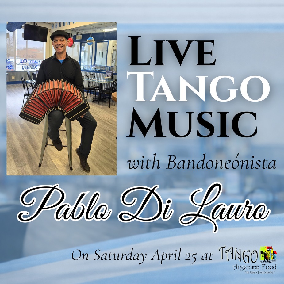 Join us Saturday, April 25th for a live two-hour tango performance by Pablo Di Lauro, a highly skilled bandoneónista with over 50 years of experience. The bandoneón is the soul of tango — hearing it live is an experience you won't forget.